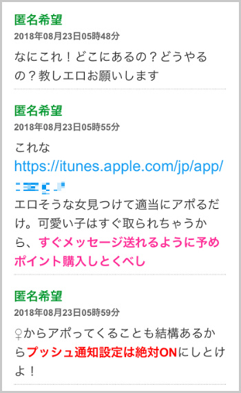 世間的には「男はヤリ目ばかり」「女はメンヘラばかり」というイメージもありますが、完全無料なのでとりあえず登録だけしておいて、ポイント制のPCMAXやハッピーメールと同時並行で使うと非常に捗ります。